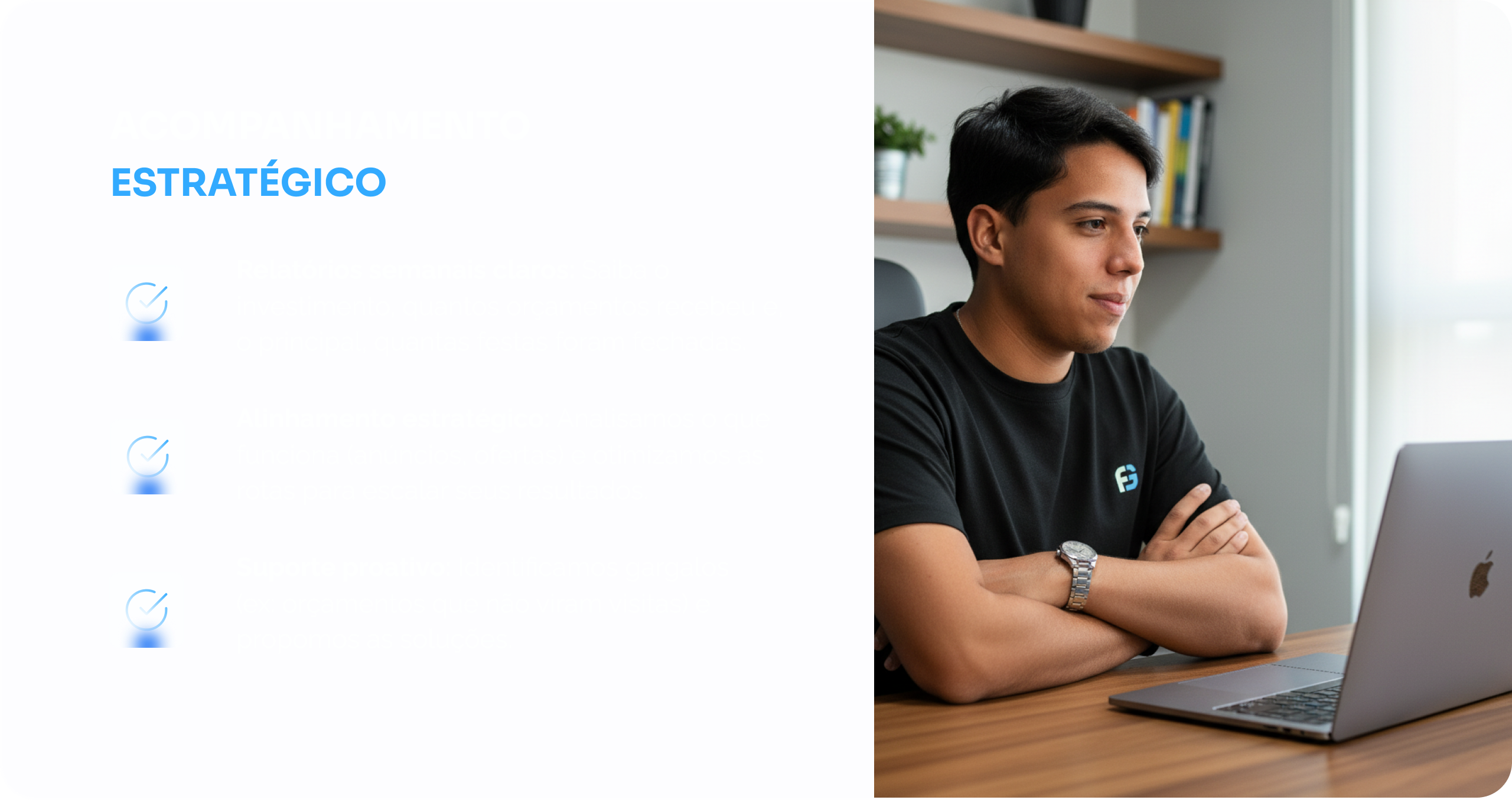 Tenha um time de especialistas ao seu lado ou terceirize totalmente seu marketing e setor comercial com a FG. Sem dor de cabeça com contratações, gestão de equipe, riscos trabalhistas ou burocracias você foca no seu espaço de eventos, e a gente foca em fazer ele crescer.